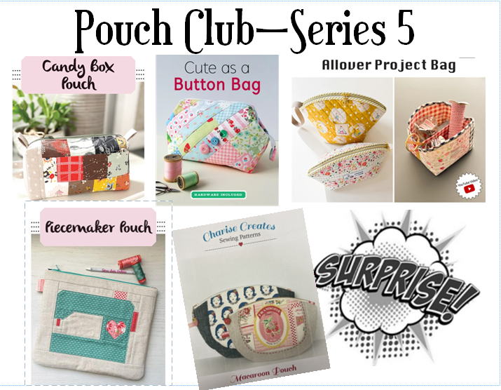 Every month bring your sewing machine and basic sewing supplies to class. You will be able to pick up your pouch kit the week prior to class, so you can have your pieces cut out.